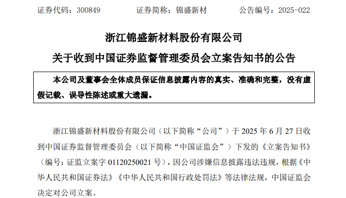 6月27日晚,锦盛新材(300849)公告,公司于2025年6月27日收到中国证监会下发的《立案告知书》(编号:证监立案字01120250021号),因公司涉嫌信息披露违法违规,根据《中华人民共和国证券法》《中华人民共和国行政处罚法》等法律法规,中国证监会决定对公司立案。